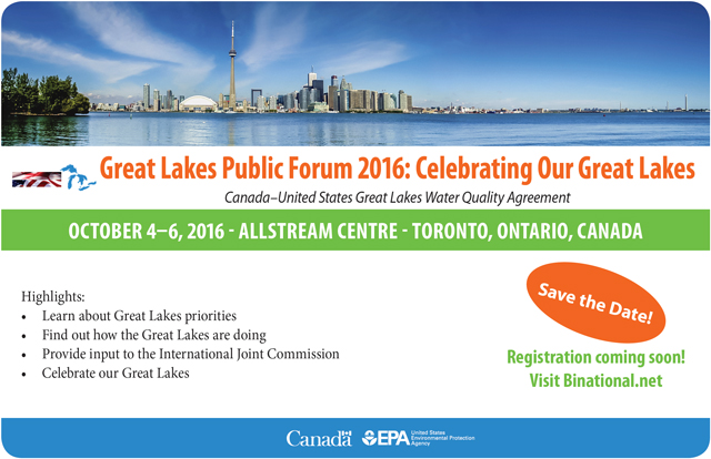 The next Great Lakes Public Forum will take place on October 4-6, 2016 at the Allstream Centre in Toronto, Ontario, Canada. The Public Forum will provide an opportunity for the Governments of Canada and the United States to discuss and receive public comments on the state of the lakes and binational priorities for science and action, as well as an opportunity for the International Joint Commission to discuss and receive public input on the Progress Report of the Parties. The Forum takes place once every three years, and allows for significant public input into the implementation of the 2012 Great Lakes Water Quality Agreement. More information on the event will follow.