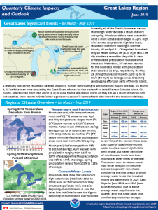 The “Quarterly Climate Impacts and Outlook: Great Lakes Region” is a brief bulletin published jointly by the National Oceanic and Atmospheric Administration and Environment and Climate Change Canada, summarizing the latest season’s weather and water level conditions and weather and water level-related impacts over the Great Lakes and provides an outlook for the upcoming quarter. It is published roughly four weeks after the end of each season. The geographic scope covers the Great Lakes basin and includes the international portion of the St. Lawrence River. It is published in March, June, September and December covering Winter (December-February); Spring (March-May); Summer (June-August) and Fall (September-November).