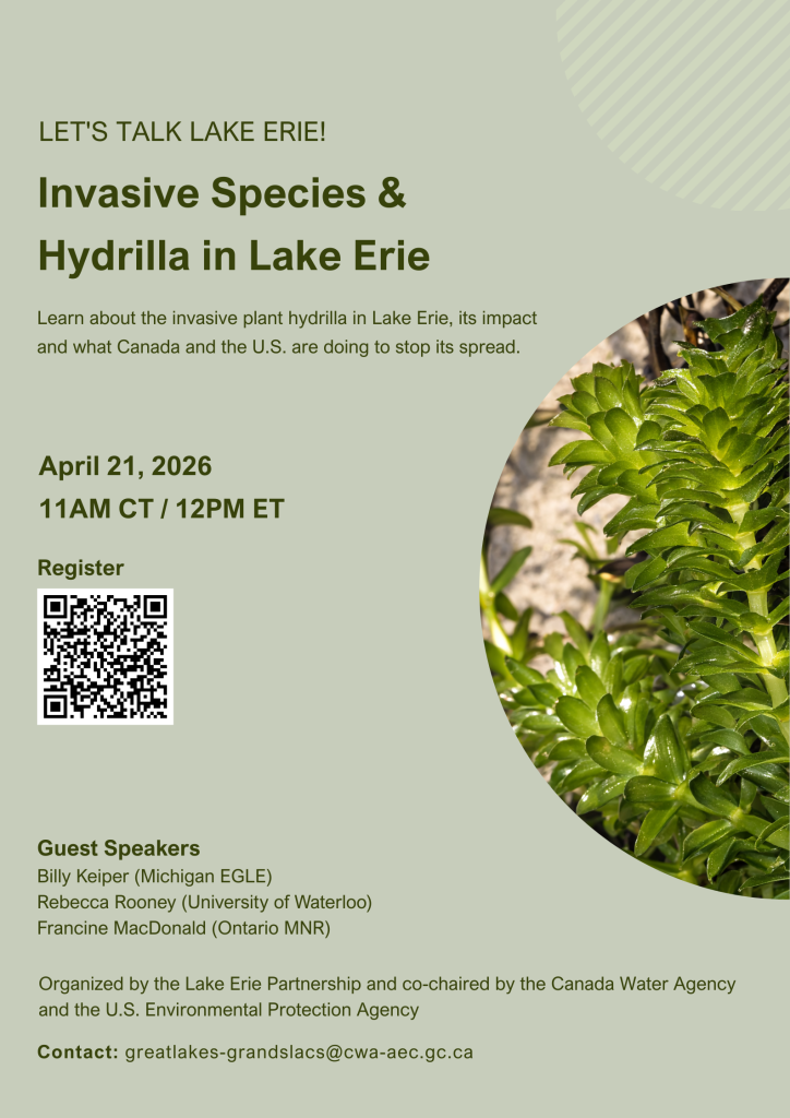 Are you ready to learn about the threats invasive species pose to Lake Erie and what is being done to protect the lake? Join us on April 21, 2026, at 11 am CT (12 pm ET) for a one-hour public webinar, “Invasive Species and Hydrilla in Lake Erie,” as part of our Let’s Talk Lake Erie! webinar series.